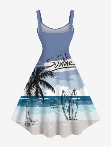 Plus Size Coconut Tree Seascape Sailboat Print Hawaii Tank Dress - Blue - 1x