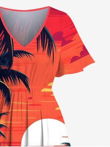 Plus Size Coconut Tree Seascape Sun Cloud Print Split Hawaii Midi Dress - Orange - 4x