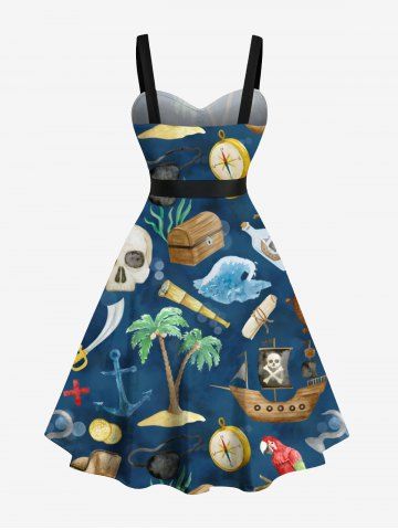 Plus Size Coconut Tree Skull Parrot Sailboat Print Hawaii Cruise Button A Line Dress with Removable Belt - Deep Blue - 2x