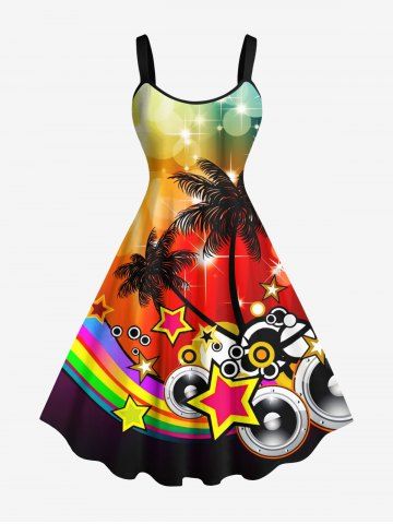 Plus Size Coconut Tree Star Music Tape Rainbow Glitter Sparkling Ombre Light Spot Print Hawaii A Line Dress - Yellow - 1x