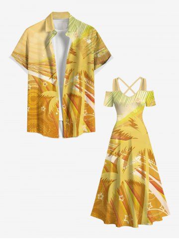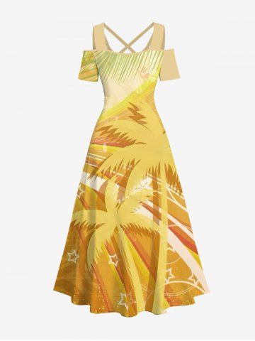 Plus Size Coconut Tree Stars Highway Print Hawaii Crisscross A Line Maxi Dress - Yellow - 1x