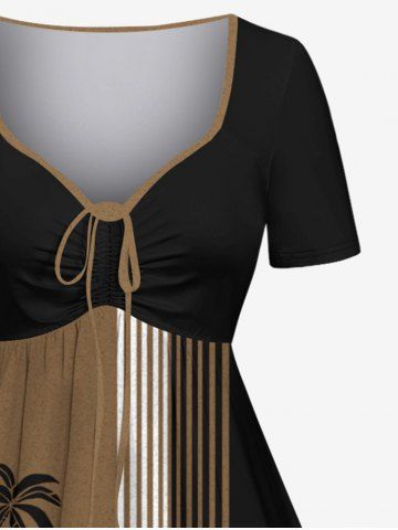 Plus Size Coconut Tree Stripes Colorblock Print Cinched Hawaii Dress - Coffee - S