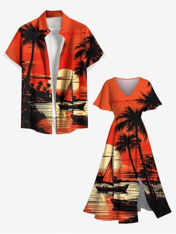 Plus Size Coconut Tree Sun Bird Boat Seascape Print Split Hawaii Midi Dress - Orange - S