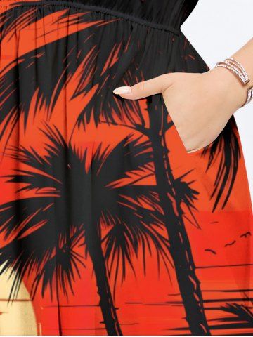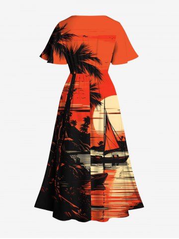 Plus Size Coconut Tree Sun Bird Boat Seascape Print Split Hawaii Midi Dress - Orange - 1x