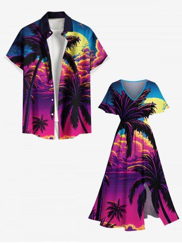 Plus Size Coconut Tree Sun Cloud Ombre Print Split Hawaii Midi Dress - Purple - 2x