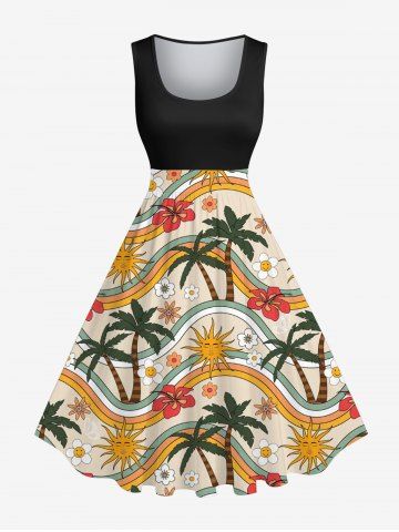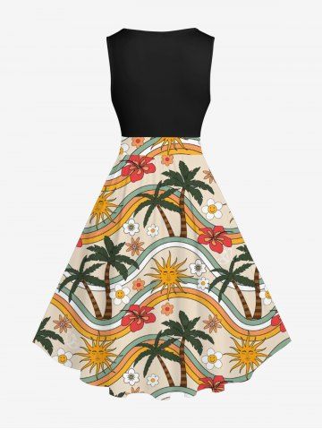 Plus Size Coconut Tree Sun Floral Rainbow Print Hawaii Vintage Swing A Line Dress - Multi-a - 4x