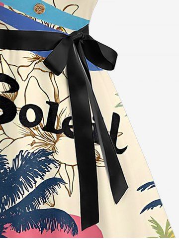 Plus Size Coconut Tree Sun Flower Letter Print Hawaii Button A Line Dress with Removable Belt - Light Coffee - 3x