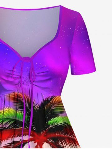 Plus Size Coconut Tree Sun Flowers Seascape Print Cinched Hawaii Dress - Purple - 5x