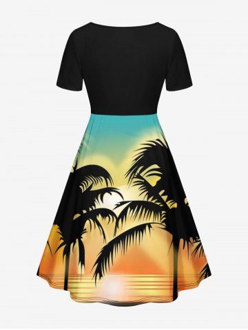 Plus Size Coconut Tree Sun Ombre Colorblock Print Cinched Hawaii Dress - Black - 6x