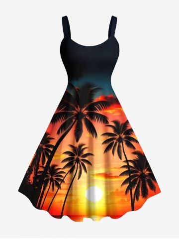 Graphic Dresses > Plus Size Coconut Tree Sun Ombre Dusk Print Hawaii A Line Tank Dress