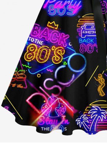 Plus Size Coconut Tree Sun Recorder Letters Neon Print Buttons Turn Down Collar Hawaii Dress With Belt - Black - 2x