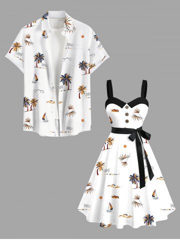 Plus Size Coconut Tree Sun Sailboat Print Buttons Turn Down Collar Hawaii Dress With A Belt - White - L