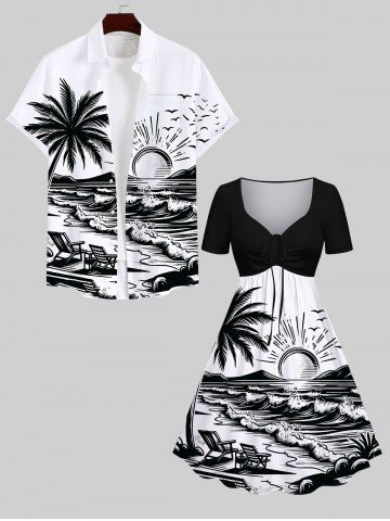 Plus Size Coconut Tree Sun Sea Waves Bird Chairs Print Cinched Hawaii Dress - Black - Xs