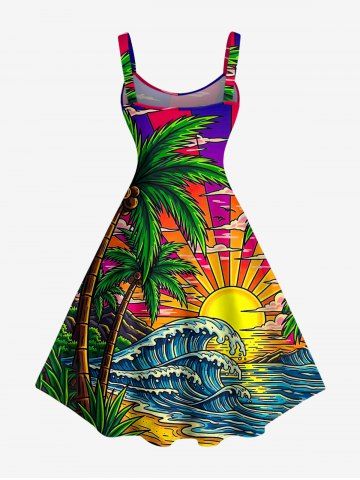 Graphic Dresses > Plus Size Coconut Tree Sun Sea Waves Cloud Print Hawaii Tank Dress