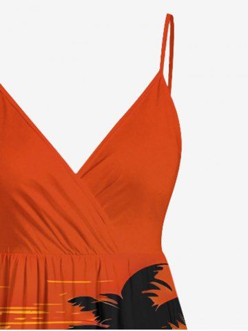 Plus Size Coconut Tree Sun Seascape Bird Print Surplice Hawaii Cami Dress - Orange - L