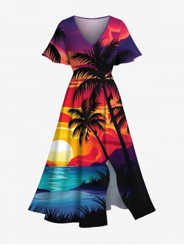 Graphic Dresses > Plus Size Coconut Tree Sun Seascape Cloud Print Split Hawaii Midi Dress
