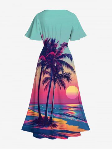 Plus Size Coconut Tree Sun Seascape Ombre Print Split Hawaii Midi Dress - Multi-a - 3x