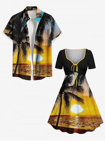 Plus Size Coconut Tree Sun Seascape Print Cinched Hawaii Dress - Black - L