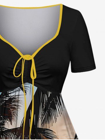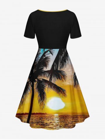 Plus Size Coconut Tree Sun Seascape Print Cinched Hawaii Dress - Black - 1x