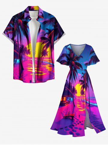 Plus Size Coconut Tree Sun Swascape Print Split Hawaii Midi Dress - Hot Pink - Xs