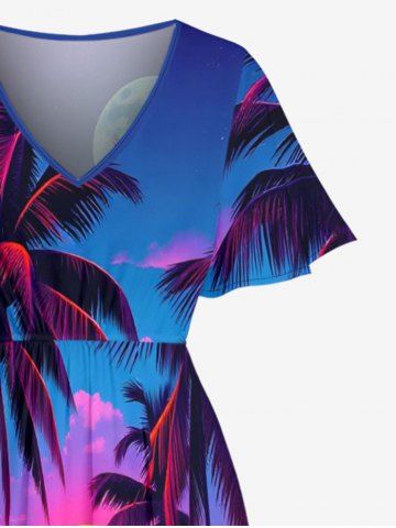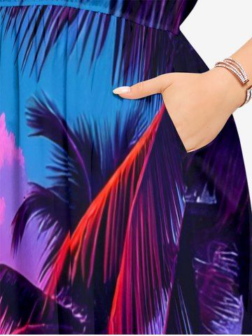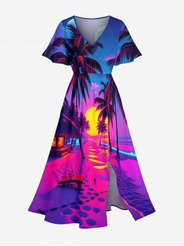 Plus Size Coconut Tree Sun Swascape Print Split Hawaii Midi Dress - Hot Pink - 6x
