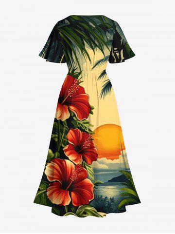 Graphic Dresses > Plus Size Coconut Tree Sun Tropical Leaf Hibiscus Flower Print Hawaii Split Pocket A Line Midi Dress