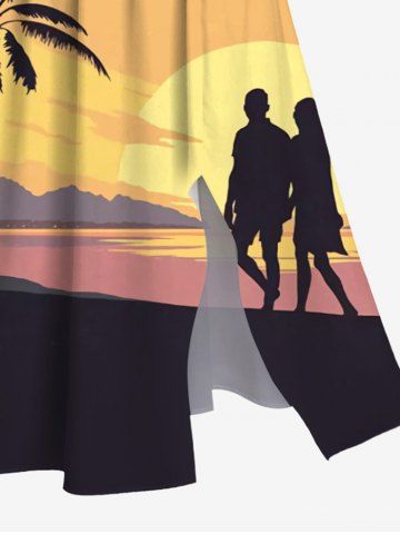 Plus Size Coconut Tree Sunset Mountain Couples Print Split Hawaii Dress - Yellow - 1x