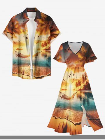 Plus Size Coconut Tree Sunset Ombre Dusk Sea Print Hawaii Split Pocket A Line Midi Dress - Light Brown - Xxs