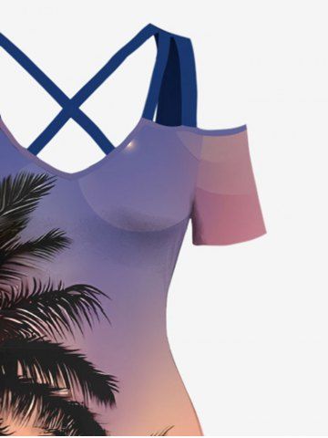 Graphic Dresses > Plus Size Coconut Tree Sunset Ombre Sky Print Cold Shoulder Crisscross Hawaii Maxi Dress