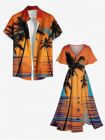 Plus Size Coconut Tree Sunset Sea Print Split Hawaii Midi Dress - Orange - Xxs