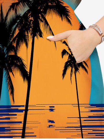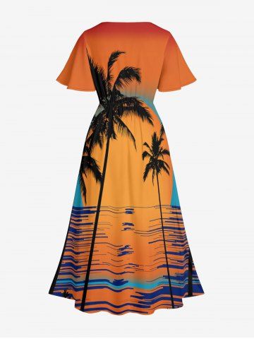 Plus Size Coconut Tree Sunset Sea Print Split Hawaii Midi Dress - Orange - 5x