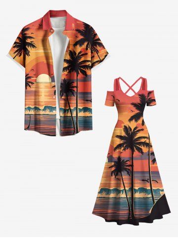 Plus Size Coconut Tree Sunset Sea Waves Print Cold Shoulder Crisscross Hawaii Maxi Dress - Orange - 2x