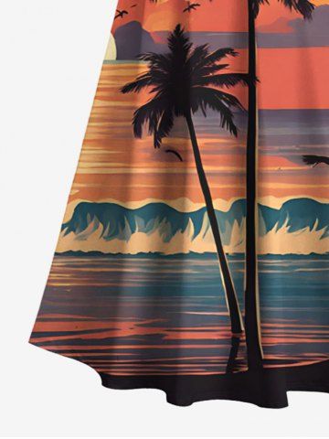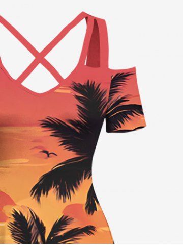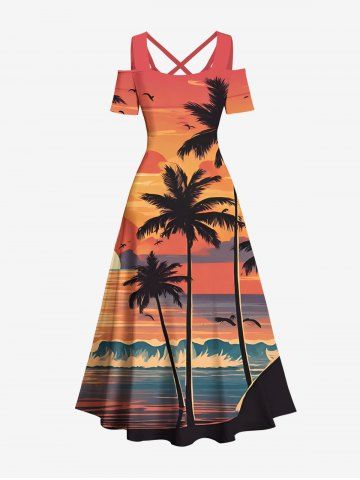 Plus Size Coconut Tree Sunset Sea Waves Print Cold Shoulder Crisscross Hawaii Maxi Dress - Orange - 6x