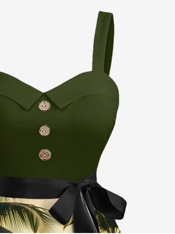 Plus Size Coconut Tree Sunshine Print Hawaii Button A Line Dress with Removable Belt - Army Green - 6x