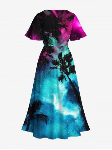 Plus Size Coconut Tree Tie Dye Ombre Galaxy Print Hawaii Split Pocket A Line Midi Dress - Multi-a - 6x