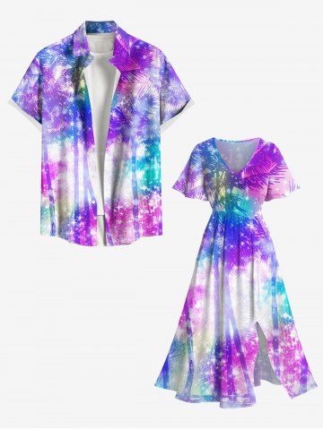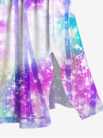 Plus Size Coconut Tree Tie Dye Ombre Stars Galaxy Print Hawaii Split Pocket A Line Midi Dress - Purple - 5x