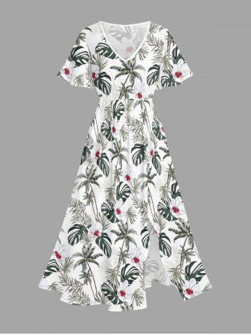 Plus Size Coconut Tree Tropical Flower Leaf Print Split Hawaii Midi Dress - White - Xxs