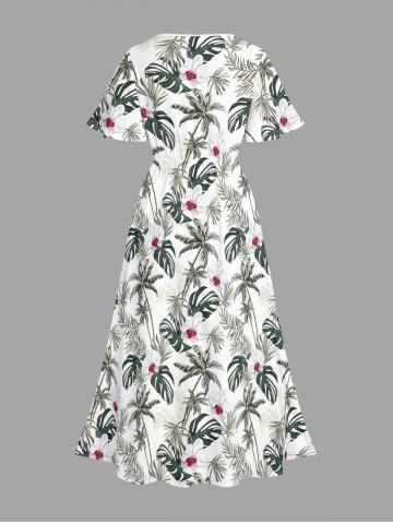 Plus Size Coconut Tree Tropical Flower Leaf Print Split Hawaii Midi Dress - White - L