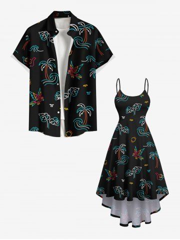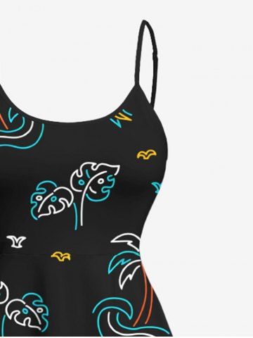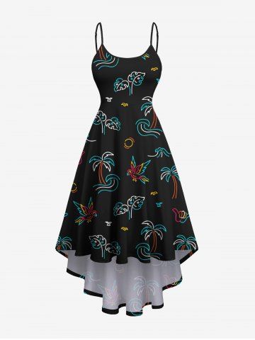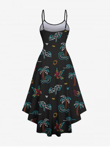 Plus Size Coconut Tree Tropical Leaf Bird Print High Low Hawaii Cami Dress - Black - S