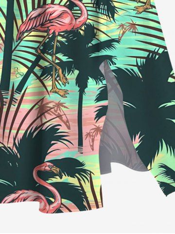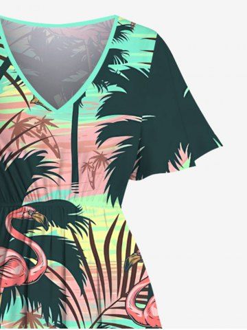 Plus Size Coconut Tree Tropical Leaf Flamingo Print Hawaii Split Pocket A Line Midi Dress - Green - Xs