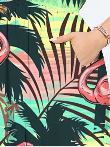 Plus Size Coconut Tree Tropical Leaf Flamingo Print Hawaii Split Pocket A Line Midi Dress - Green - S