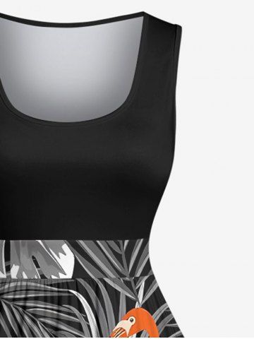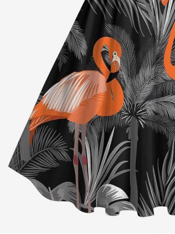 Plus Size Coconut Tree Tropical Leaf Flamingo Print Hawaii Vintage Swing A Line Dress - Black - 5x