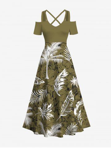 Graphic Dresses > Plus Size Coconut Tree Tropical Leaf Flower Print Hawaii Cold Shoulder Crisscross A Line Maxi Dress