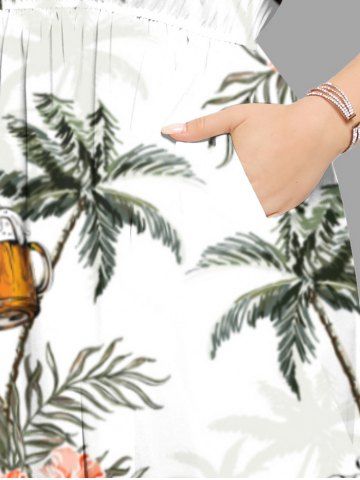 Plus Size Coconut Tree Tropical Leaf Flowers Beer Print Split Hawaii Midi Dress - White - 2x