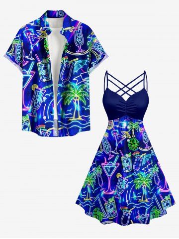 Graphic Dresses > Plus Size Coconut Tree Tropical Leaf Fruit Juice Print Ruched Lattice Crisscross Straps Hawaii Dress