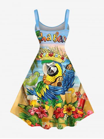 Plus Size Coconut Tree Tropical Leaf Hibiscus Flower Parrot Hula Print Hawaii A Line Dress - Sky Blue - 4x