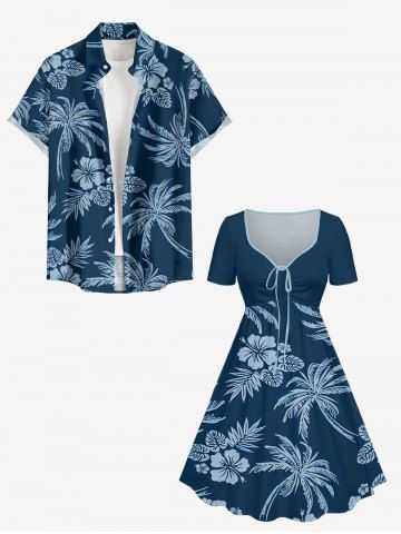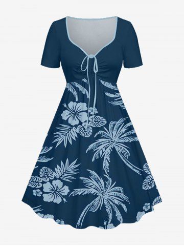 Plus Size Coconut Tree Tropical Leaf Hibiscus Flower Print Hawaii Cinched A Line Dress - Deep Blue - Xs