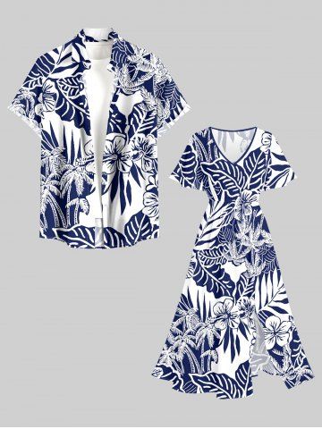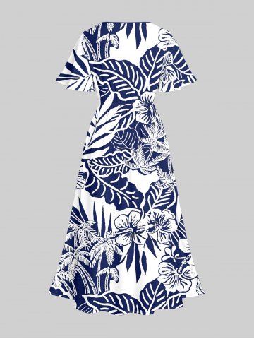 Plus Size Coconut Tree Tropical Leaf Hibiscus Flower Print Hawaii Split Pocket A Line Midi Dress - Navy Blue - Xxs