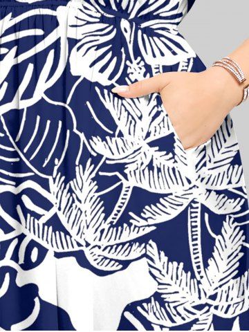 Plus Size Coconut Tree Tropical Leaf Hibiscus Flower Print Hawaii Split Pocket A Line Midi Dress - Navy Blue - Xs