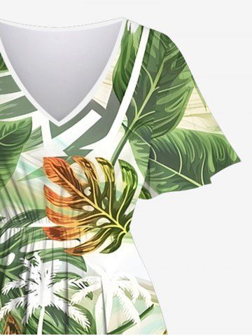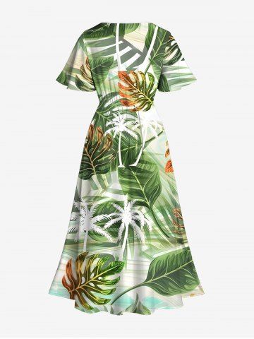 Plus Size Coconut Tree Tropical Leaf Ombre Print Hawaii Split Pocket A Line Midi Dress - Green - M